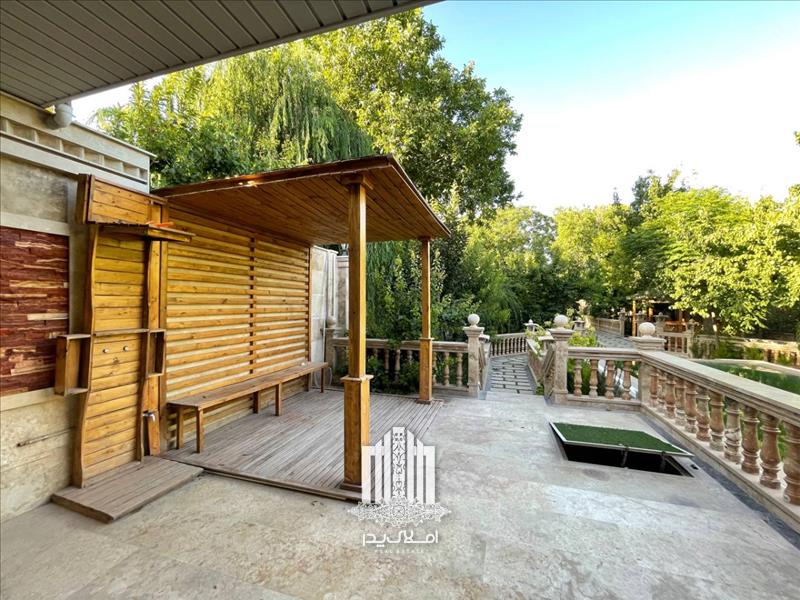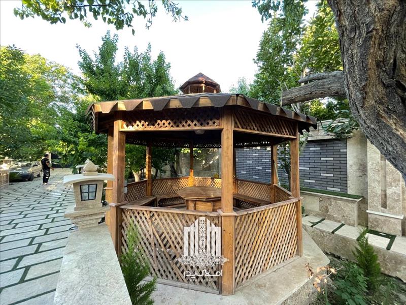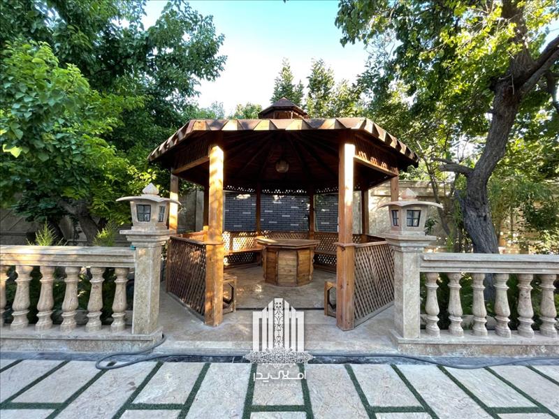 * آلاچیق بزرگ چوبی به همراه باربیکیو و آبنما سنگی در محوطه باغ ویلا