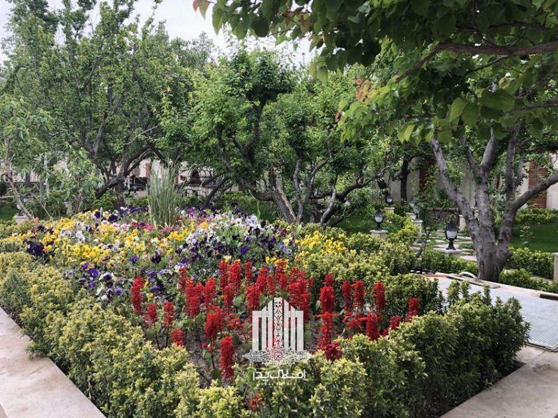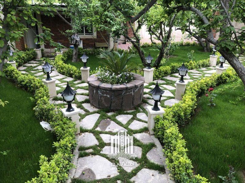 محوطه سازی فوق العاده زیبا و دلنشین با استفاده از چمن آرایی ، گل آرایی ، آبنما ، سنگ فرش و باربیکیو با تنور سنتی پخت نان به همراه آلاچیقی زیبا در محوطه باغ