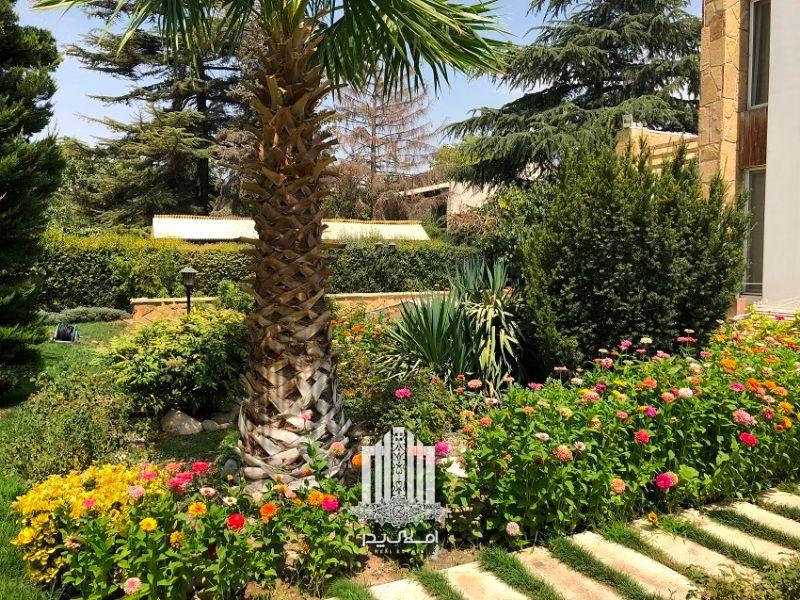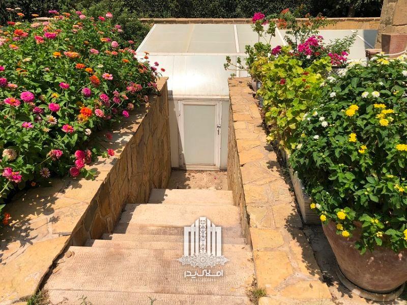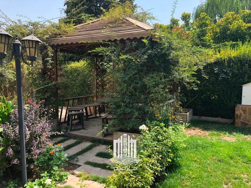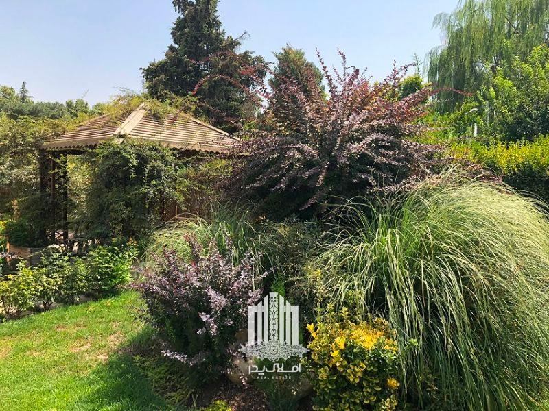 محوطه سازی شده با استفاده از گلکاری ، چمن کاری و درختان زینتی و زیبا به همراه آلاچیق زیبای چوبی در محوطه باغ ویلا