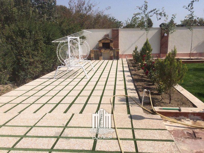 محوطه سازی زیبا و دلنشین که با استفاده از گلکاری و چمن کاری صورت گرفته است