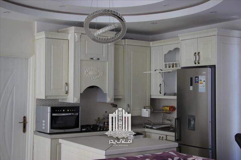 *آشپزخانه بزرگ با کابینت های ممبران و گاز رو میزی و یخچال فریزر