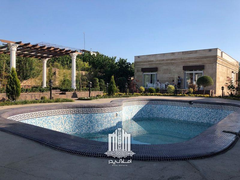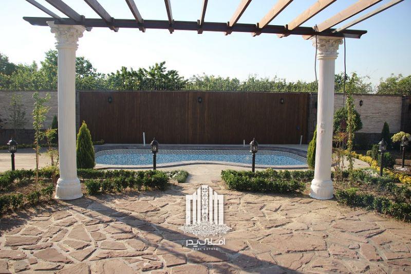 آلاچیق زیبا در مجاورت استخر و ویلا که زیبایی خاصی به باغ بخشیده است.