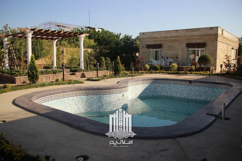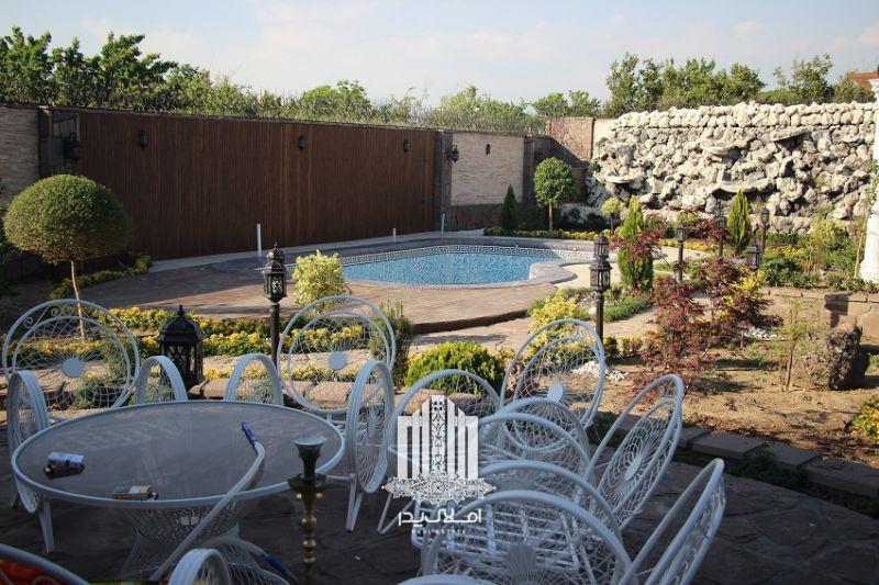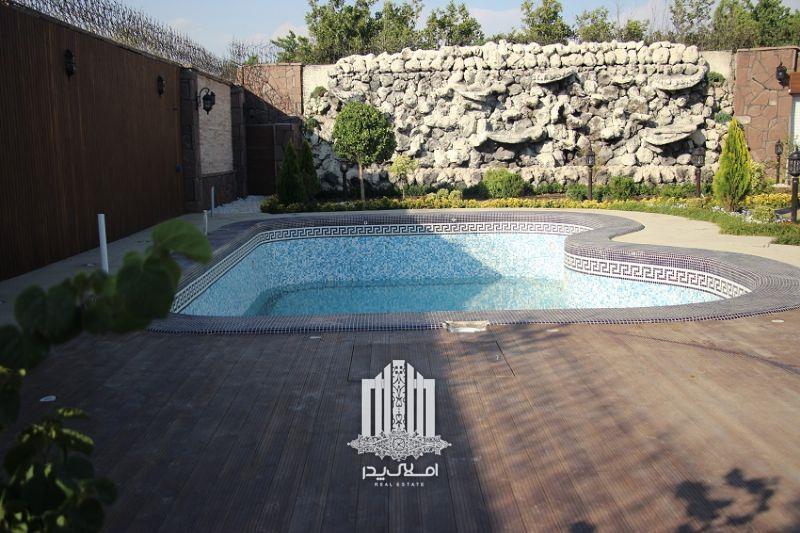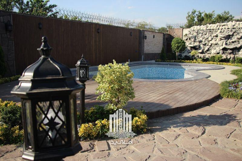استخر روباز در باغ با تاسیسات کامل 4 فصل و متریال چوب کار شده در اطراف استخر