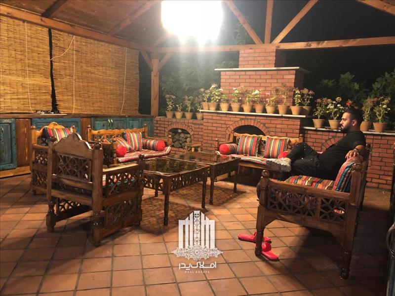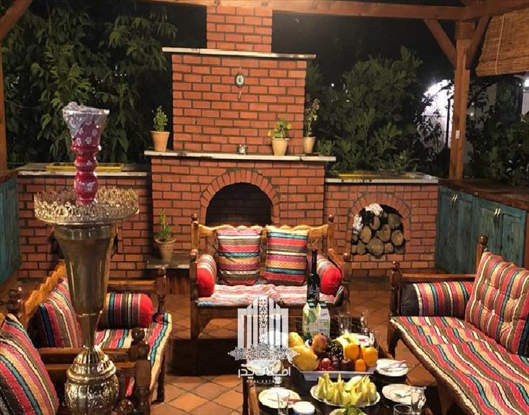 * آلاچیق بزرگ سنتی شامل یک فضای کابینتی برای تعمین لوازم این قسمت به همراه شومینه هیزمی و مبلمان سنتی برای این فضا زیبا