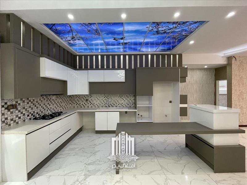 * آشپزخانه بزرگ با کابینت های طرح هایگلاس وبا تجهیزات کامل آشپزخانه ای