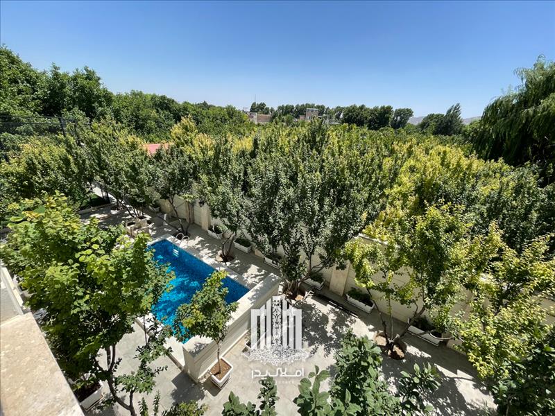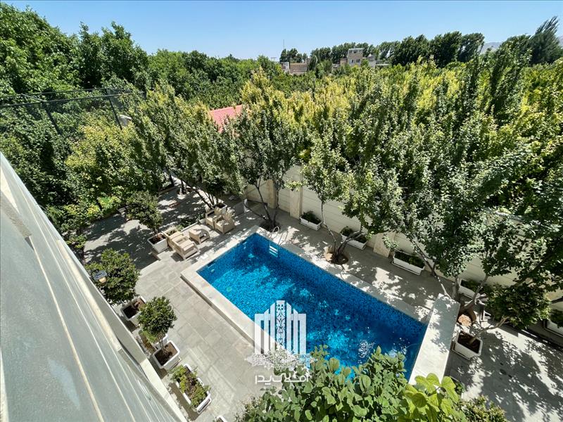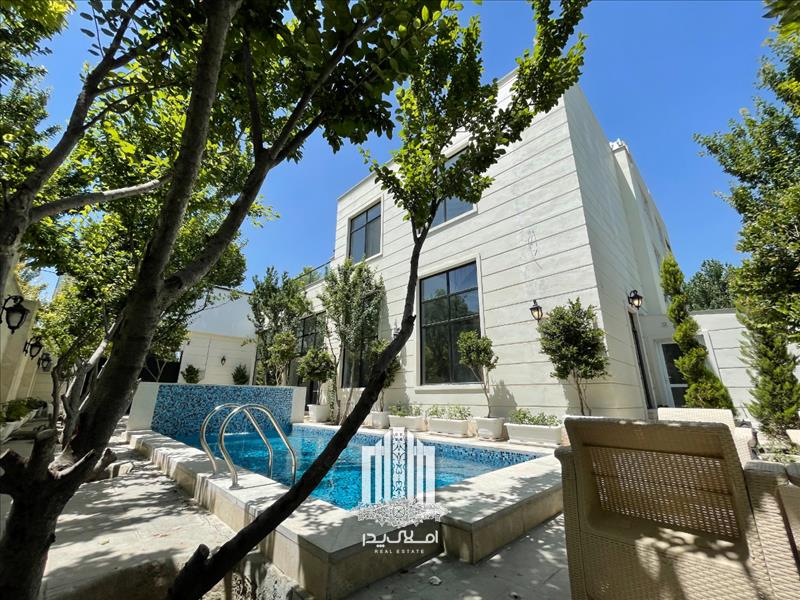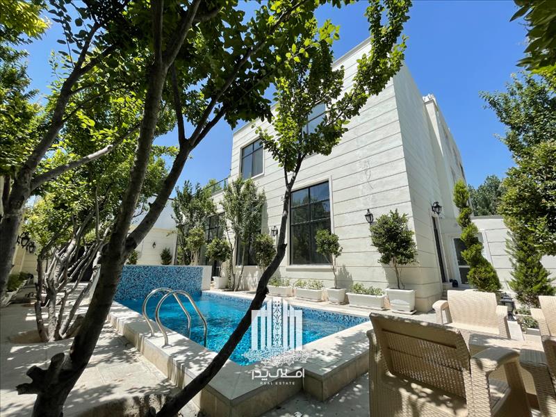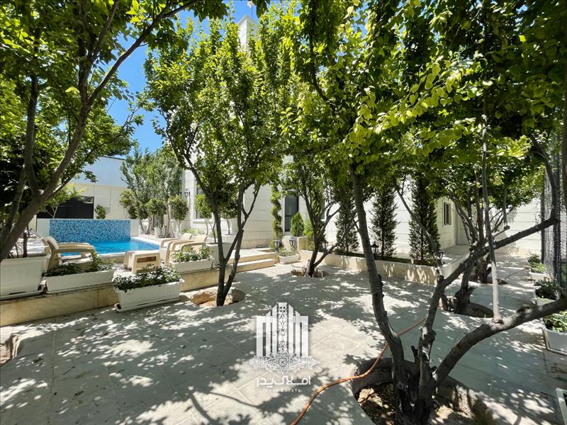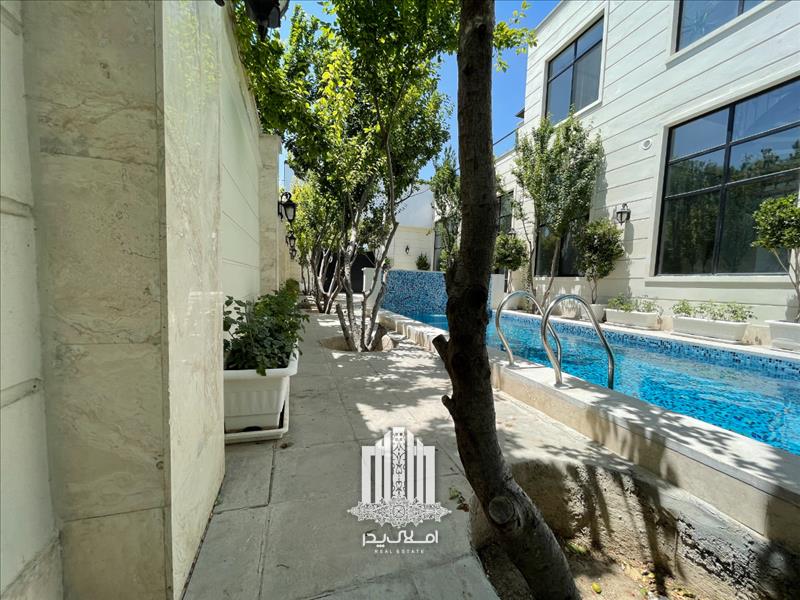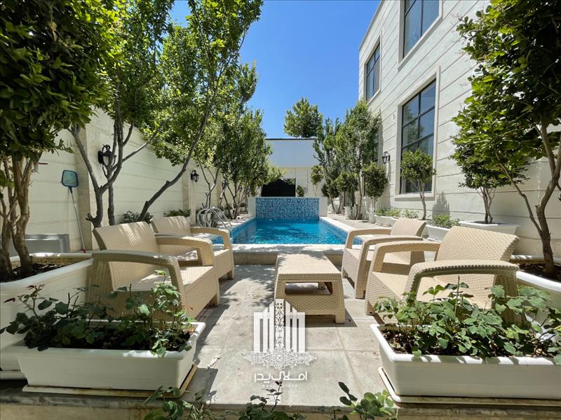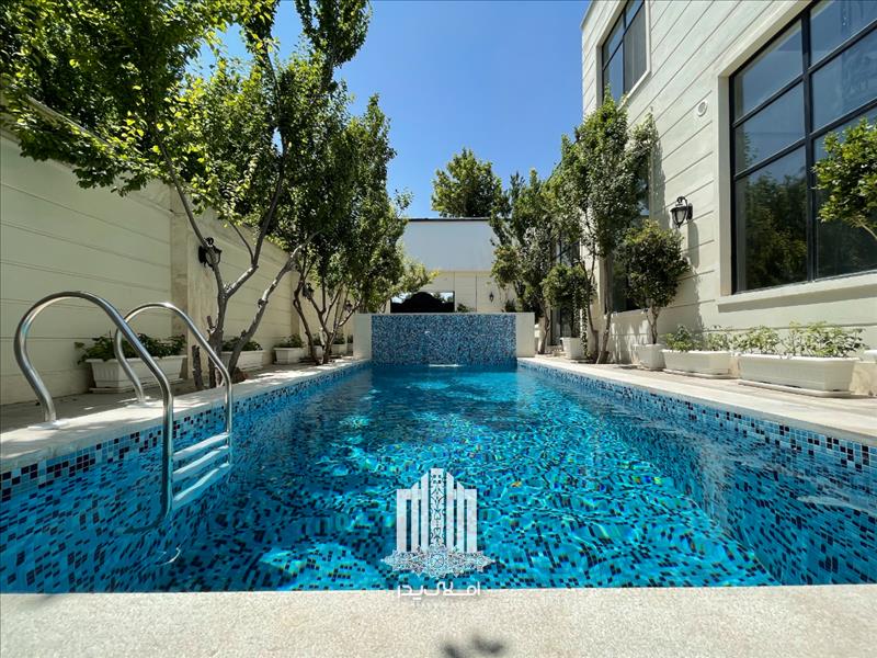 استخر رو باز چهار فصل مجهز به تصفیه خانه و گرمکن در محوطه باغ ویلا