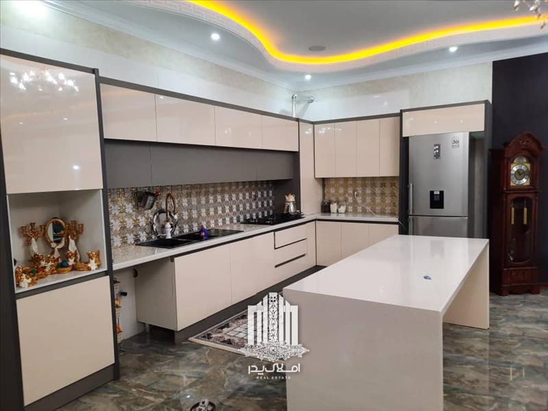 * آشپزخانه بزرگ با کابینت های طرح های گلاس و با تجهیزات کامل آشپزخانه ای ( گاز رومیزی - هود لمسی - ماشین لباسشویی - یخچال و فریزر و....)